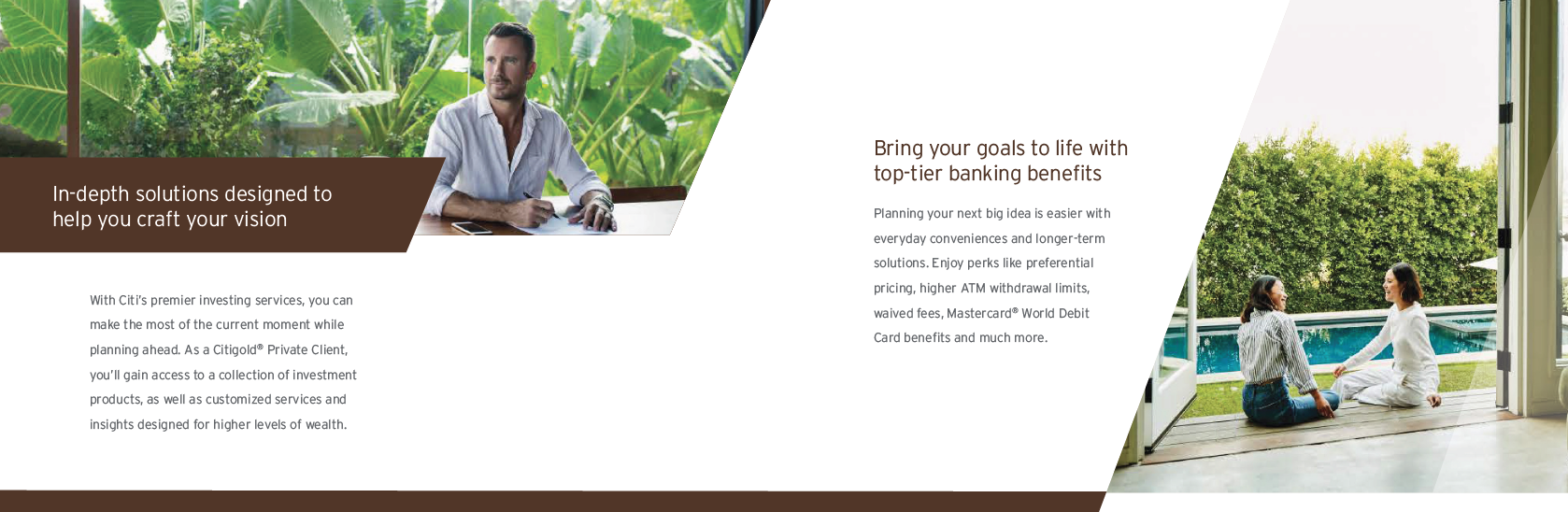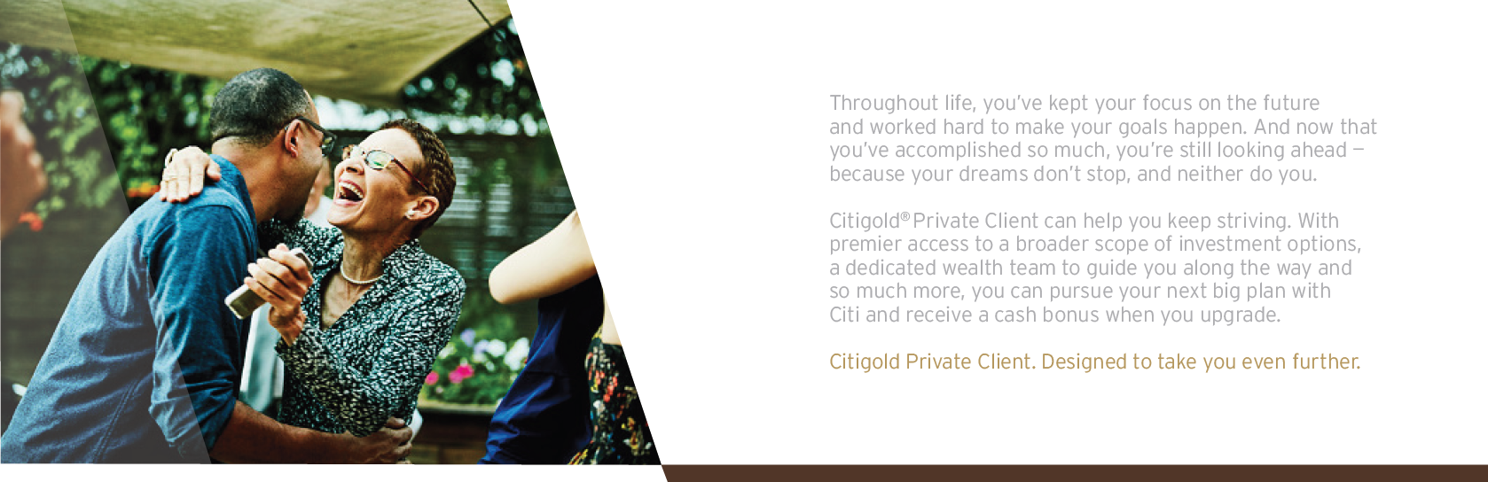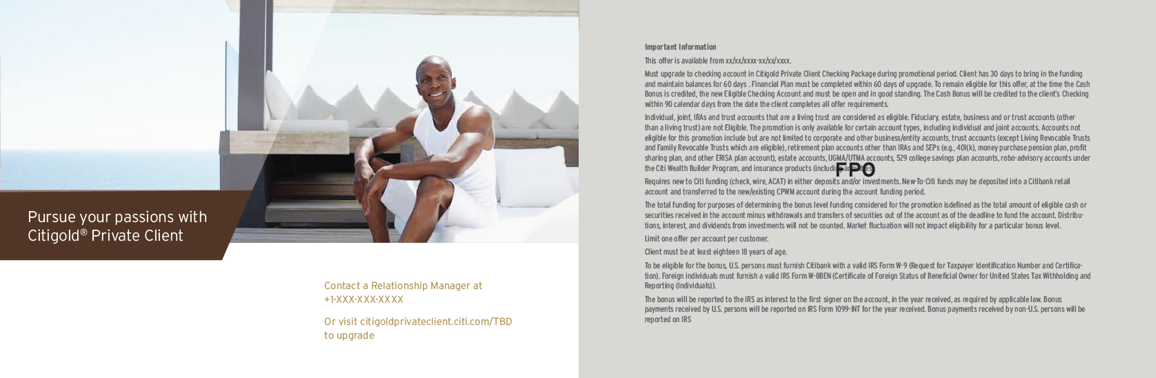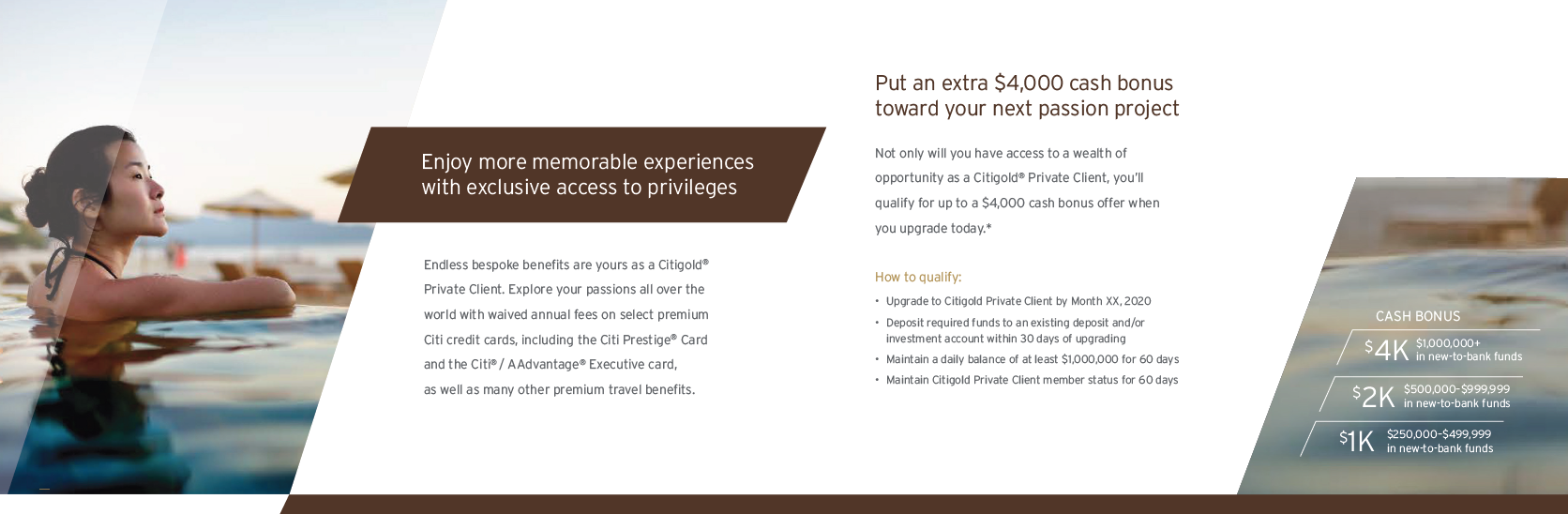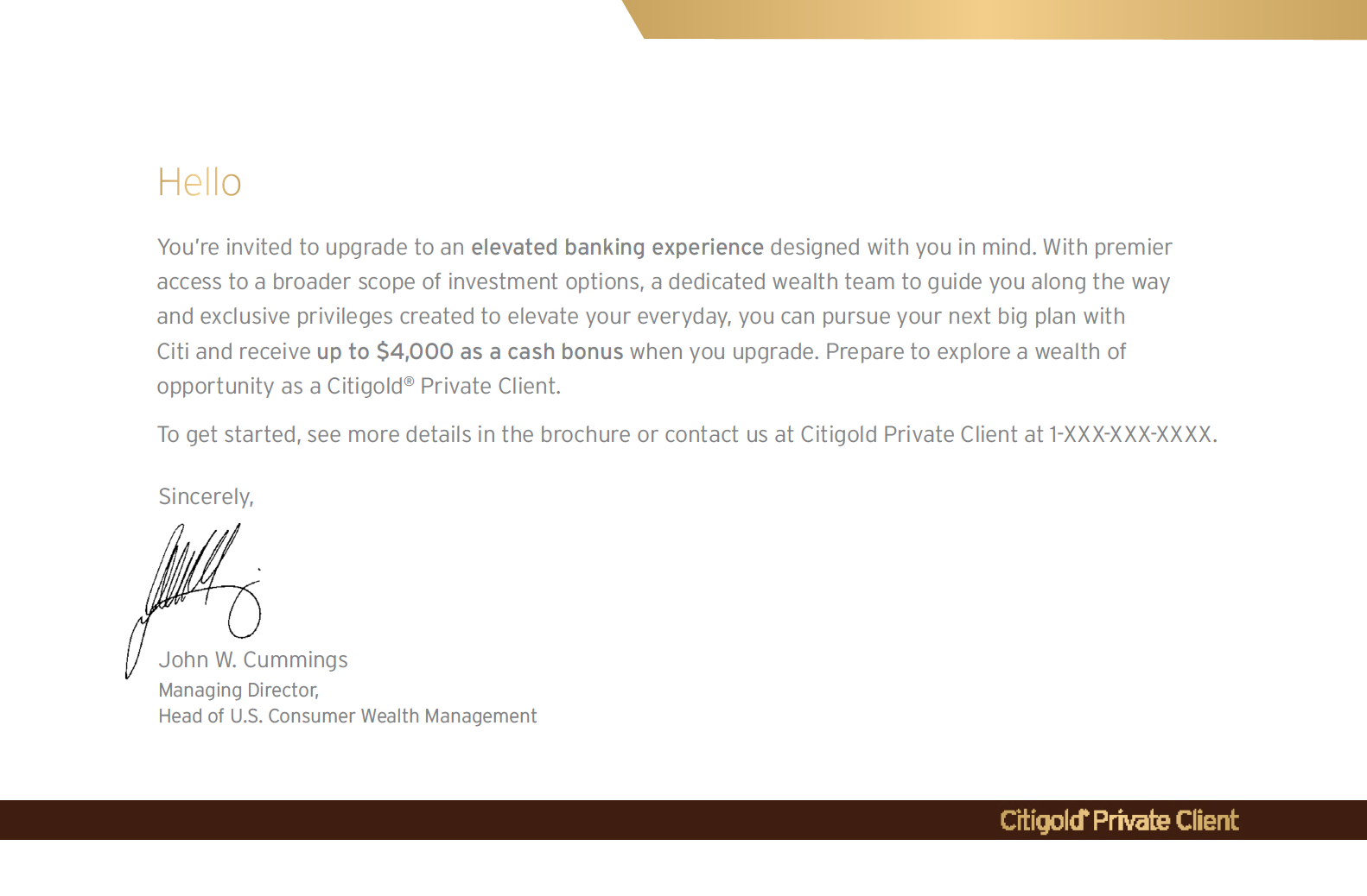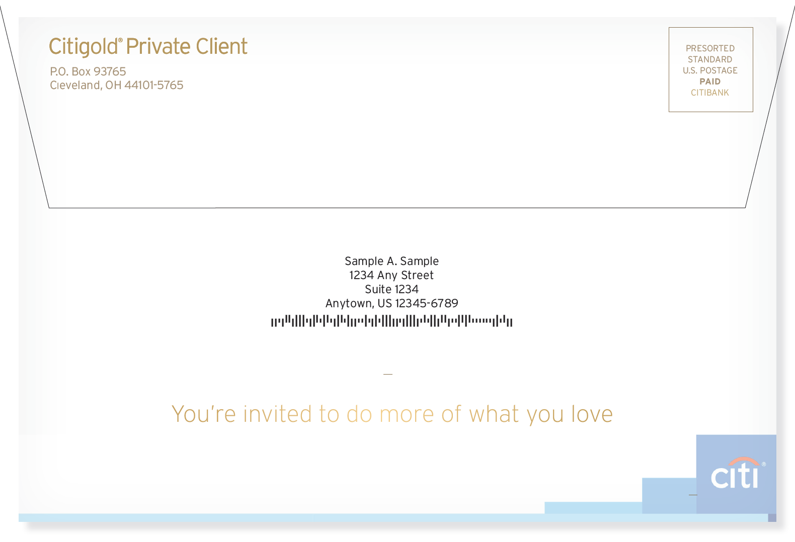 Citigold Private Client is Citi’s most elevated banking tier, requiring a minimum combined average monthly balance of $1,000,000+ in eligible linked deposits, retirement and investment accounts. We created a premier soft-touch, pocketed invitational mailer to acquire new Citigold Private Client members, share the benefits of the banking package, and promote a $4,000 cash bonus.